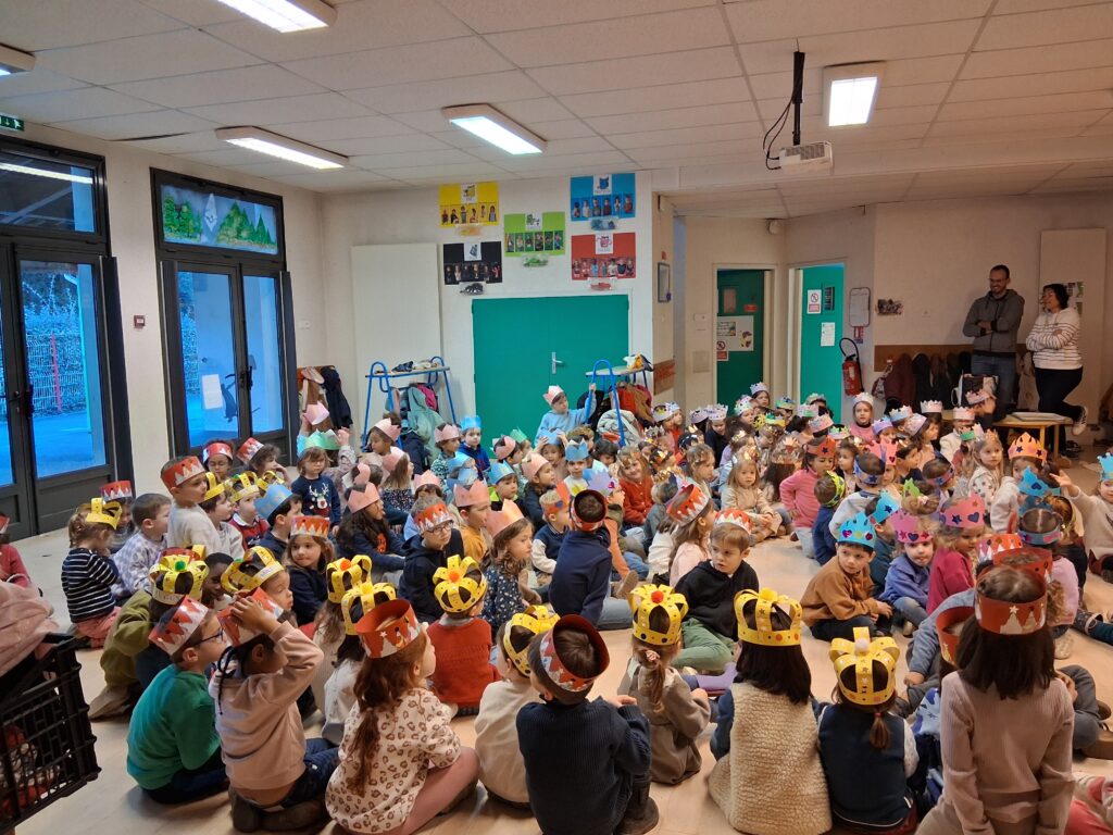 Les 6 classes de maternelle se sont réunies pour partager la galette dans la joie et la bonne humeur. Et voici nos heureux élus !