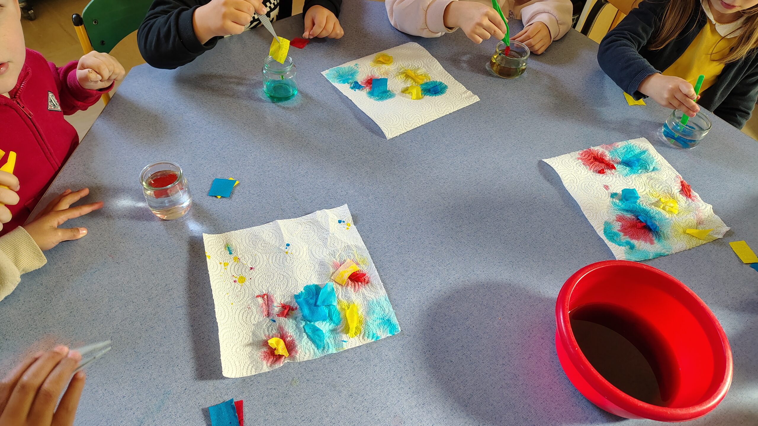 Les enfants de petite et moyenne sections s’initient aux sciences en expérimentant les mélanges de couleurs.